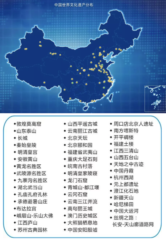 中国于1985年正式加入《保护世界文化与自然遗产公约》。1987年首次申遗成功。至今中国世界遗产总数已达55处和意大利并列世界第一!其中,世界自然遗产14项,世界自然与文化双遗产4项,总数均位居世界第一!